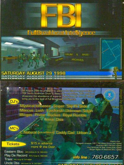 "On August 29th be prepared to witness the fullest representation of TOP North American Drum & Bass DJ's and Artists. FBI's goal is to showcase the abundance of superior talent found in Toronto and to bring you the level of Full Breakbeat Intelligence."