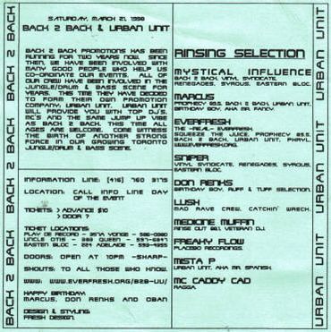 "Back 2 Back Promotions has been planning for two years now. Since then, we have been involved with many good people who help us co-ordinate our events. All of our crew have been involved in the Jungle/Drum & Bass scene for years. This time they have decided to form their own promotion company, Urban Unit. Urban Unit will provide you with Top DJ's MC's and the same Jump Up Vibe as Back 2 Back. This time all ages are welcome. Come witness the birth of another strong force in our growing Toronto Jungle/Drum & Bass scene.