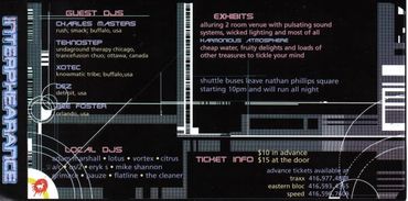 LINEUP: Charles Masters, Teknostep, Xotec, Dez, Bee Foster, Adam Marshall, Lotus, Vortex, Citrus, A/C, AS/2, Eryk S, Mike Shannon, Grimace, Pauze, Flatline, The Cleaner